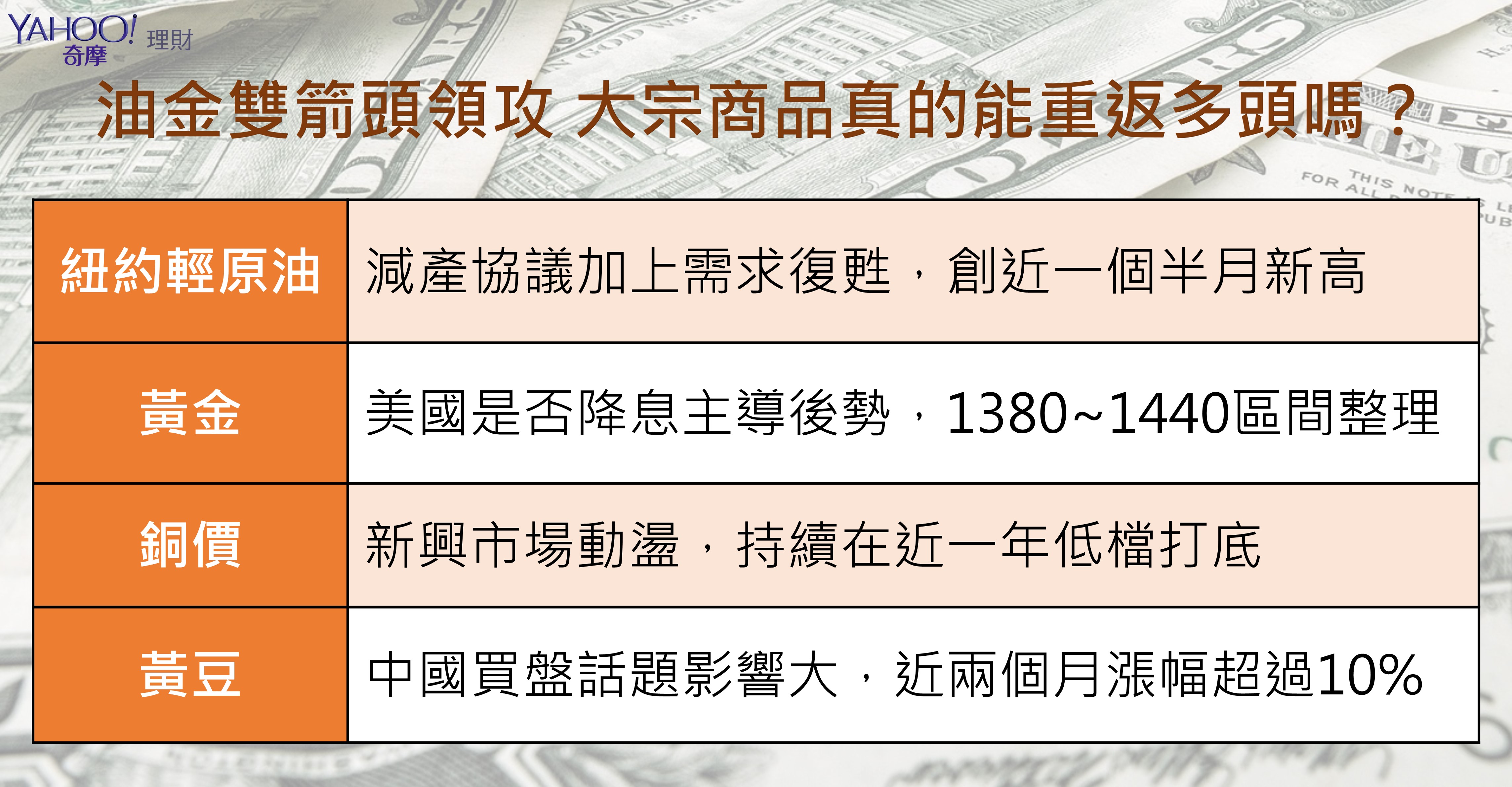 油價與黃金是近期主要大宗商品中表現最搶眼的兩個標的,若以通膨與美元走弱的影響來觀察的話,還有哪些商品也能轉強走揚呢?油價與黃金是近期主要大宗商品中表現最搶眼的兩個標的,若以通膨與美元走弱的影響來觀察的話,還有哪些商品也能轉強走揚呢?油價與黃金是近期主要大宗商品中表現最搶眼的兩個標的,若以通膨與美元走弱的影響來觀察的話,還有哪些商品也能轉強走揚呢?